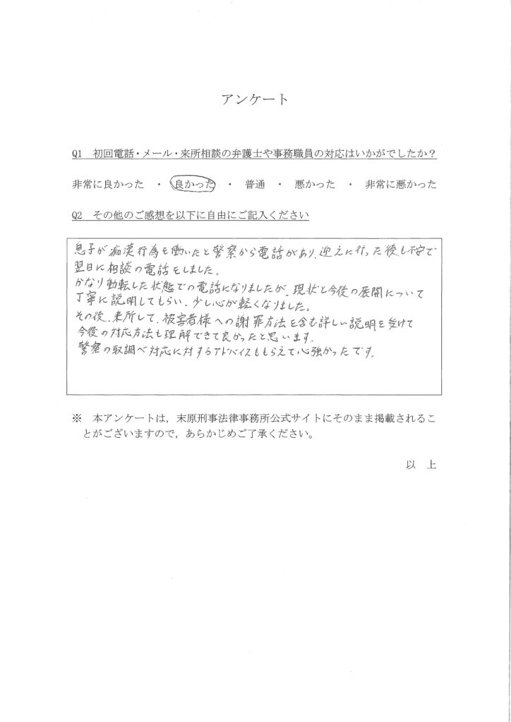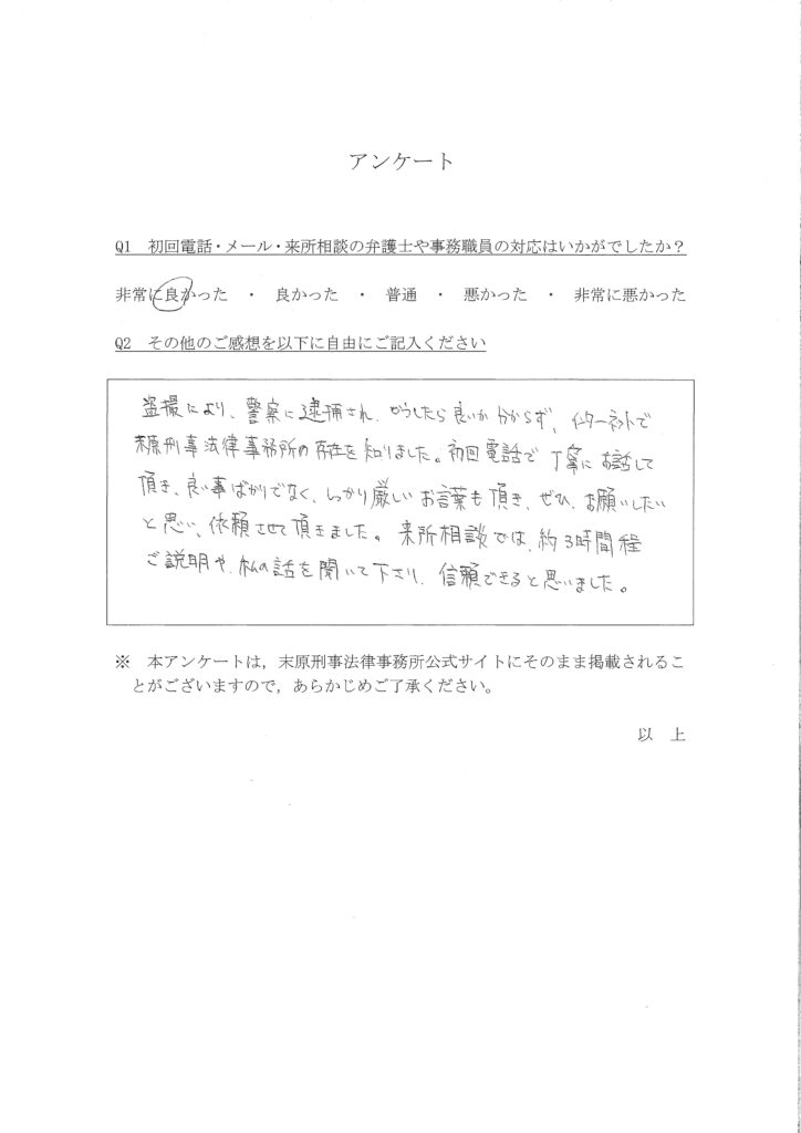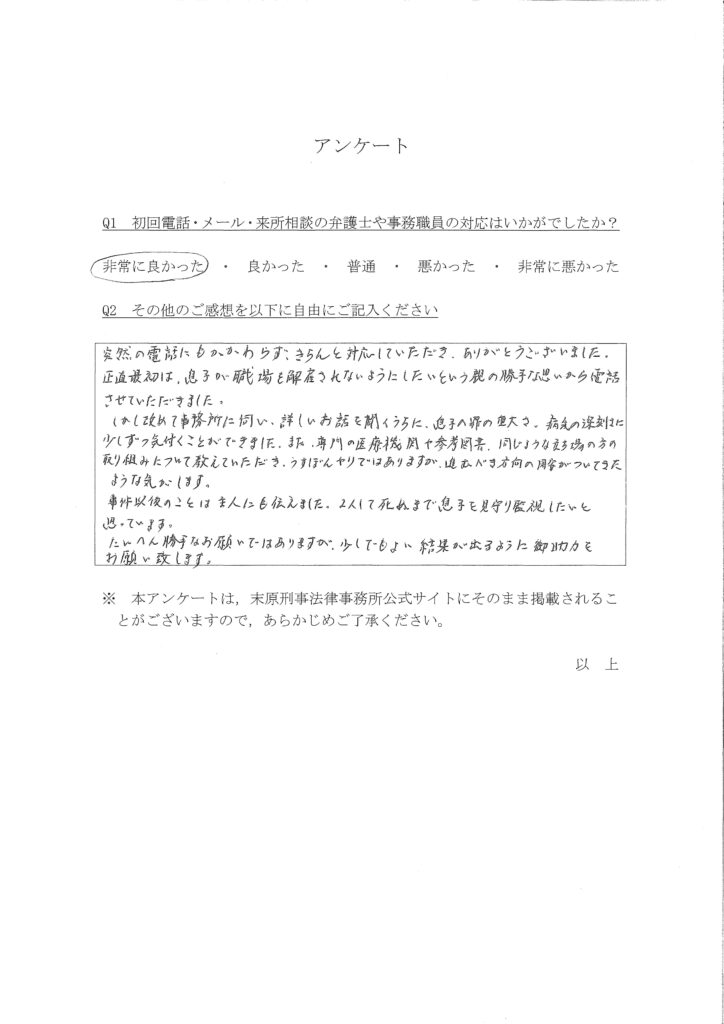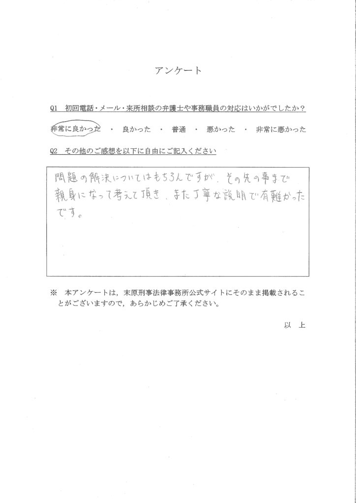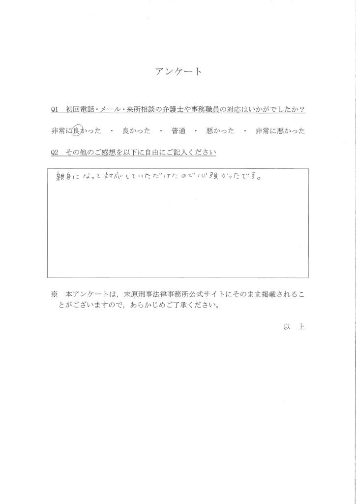 ここでは,末原刑事法律事務所がご相談を受けた事件につきまして,お客様にご記入いただいたアンケートの一部を掲載しております。