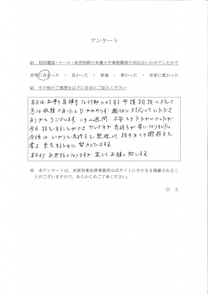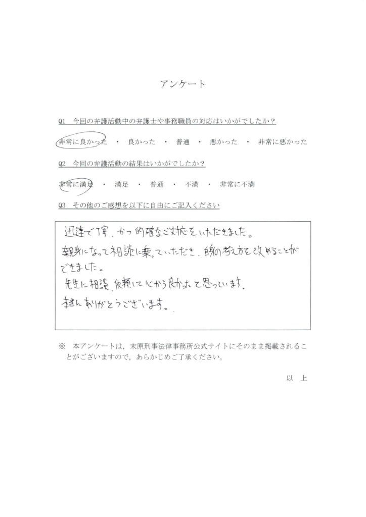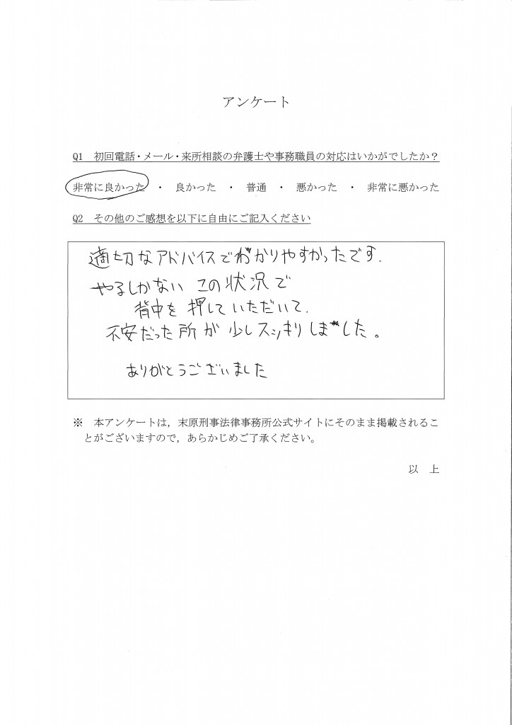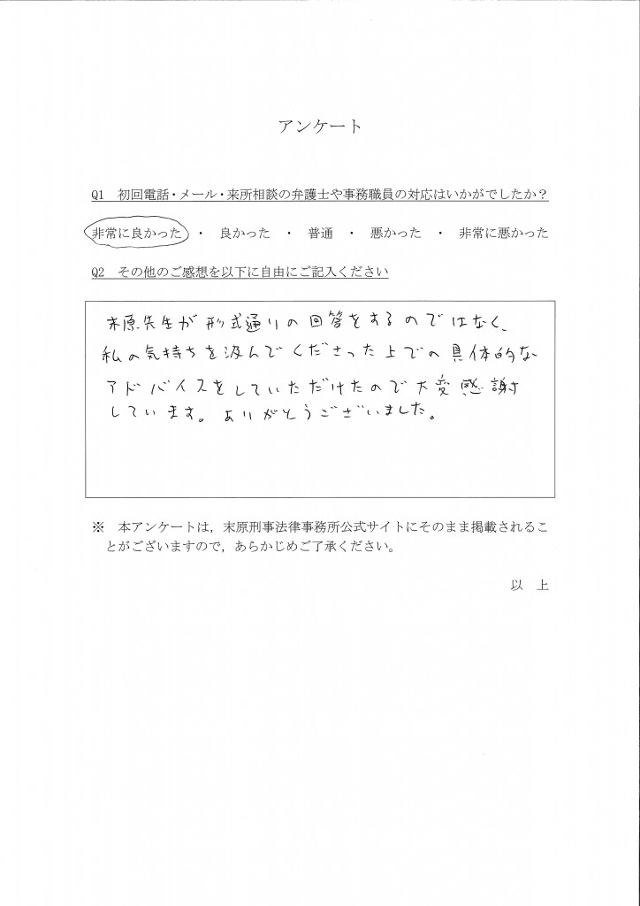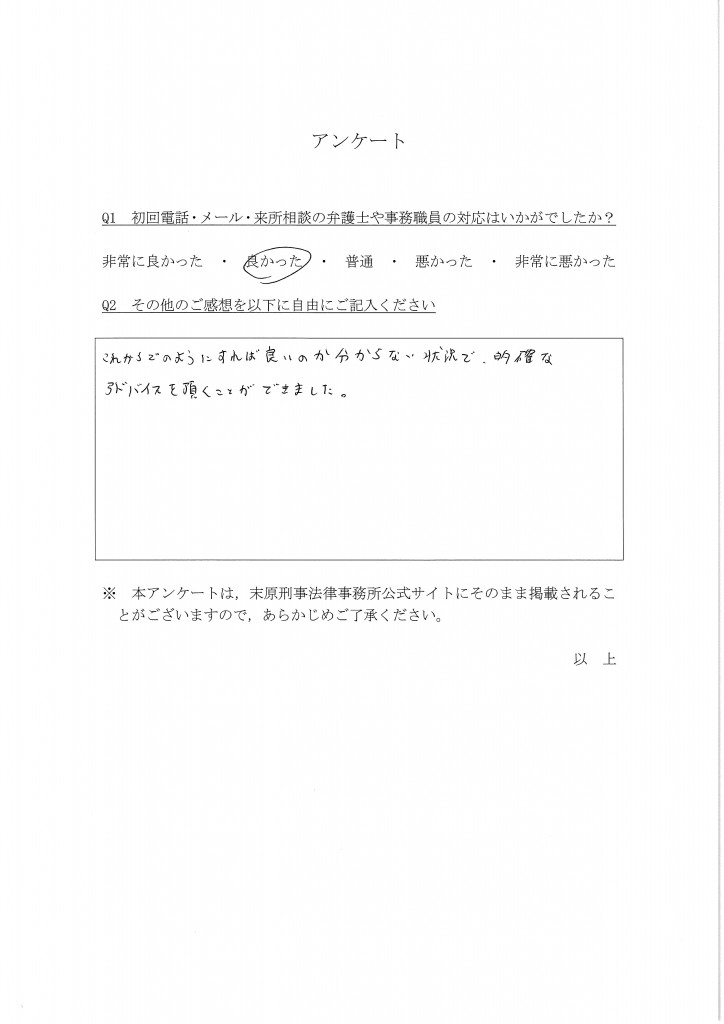 ここでは,末原刑事法律事務所がご相談を受けた事件につきまして,お客様にご記入いただいたアンケートの一部を掲載しております。