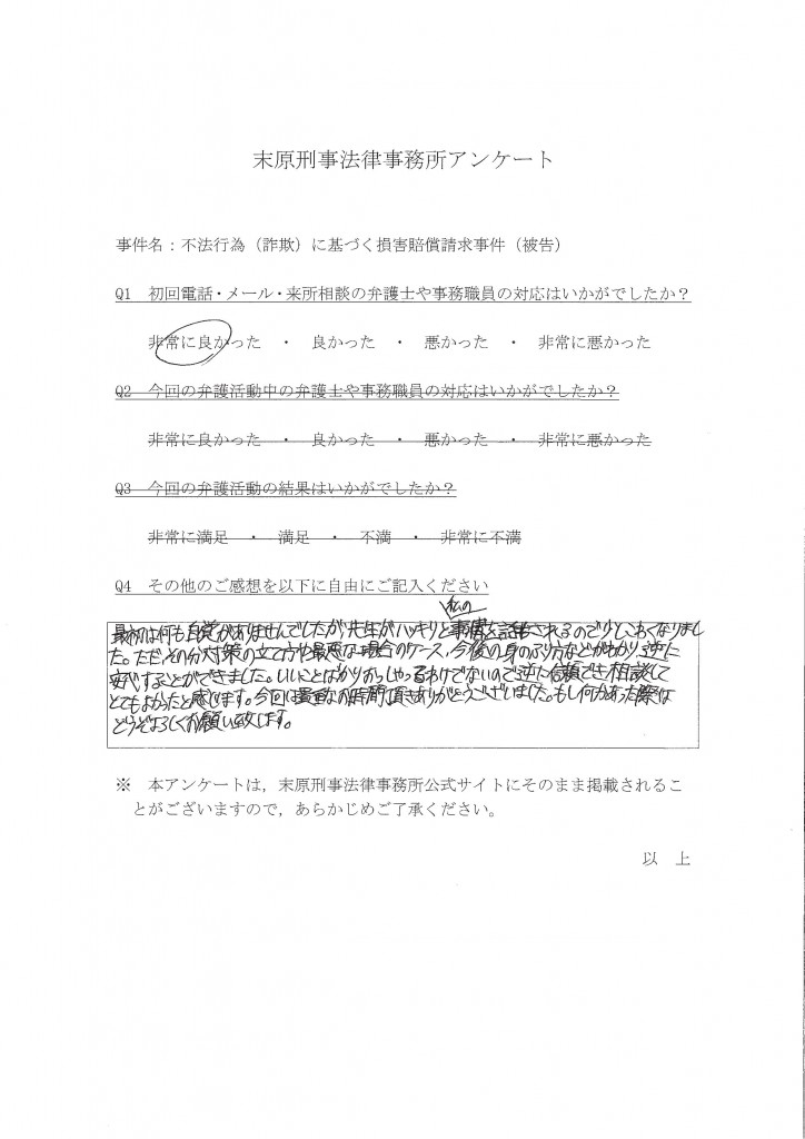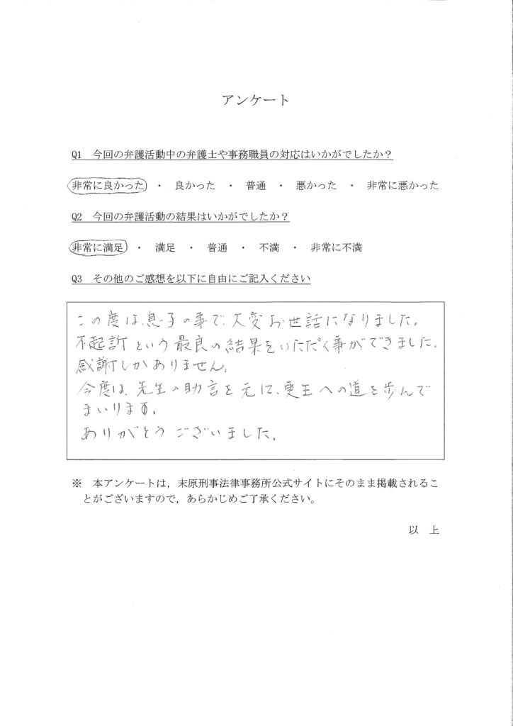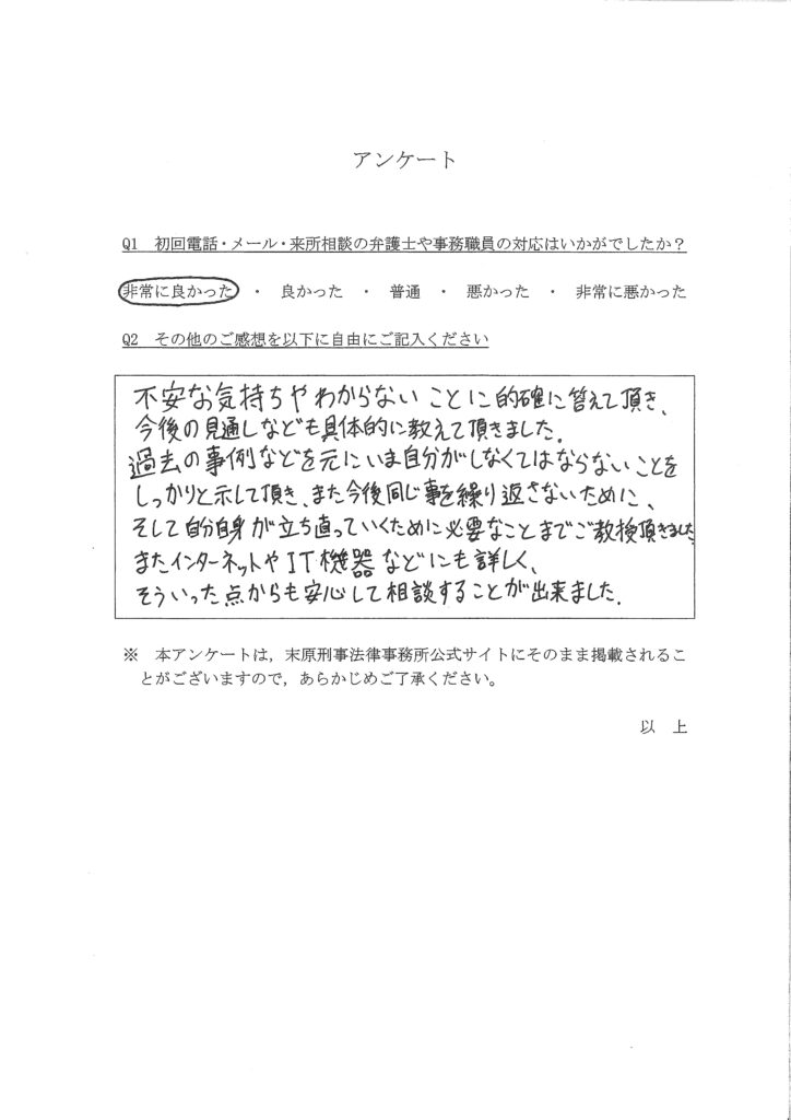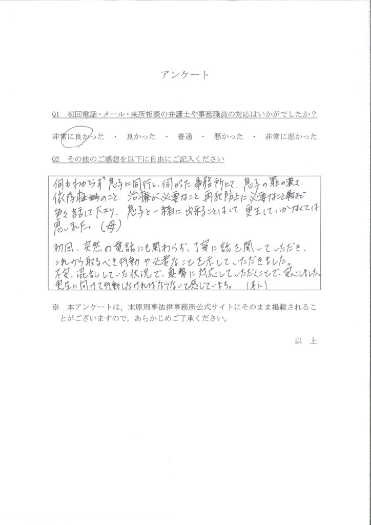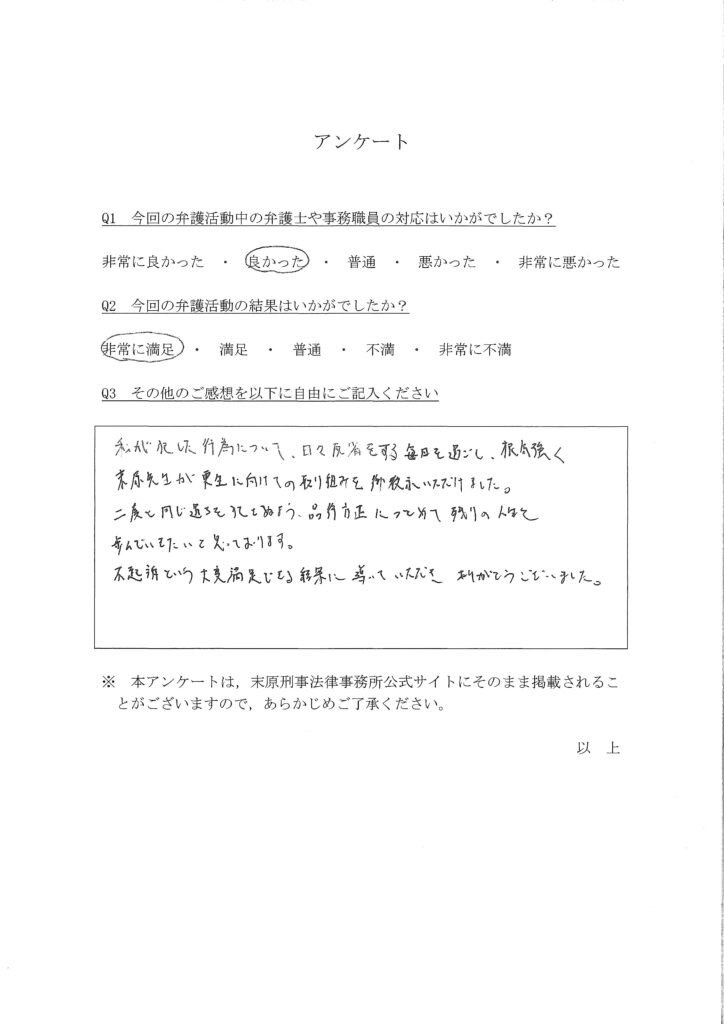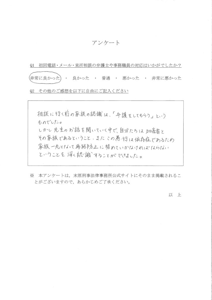 ここでは,末原刑事法律事務所がご相談を受けた事件につきまして,お客様にご記入いただいたアンケートの一部を掲載しております。